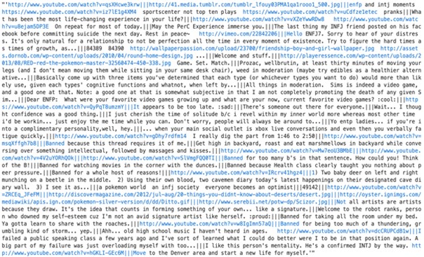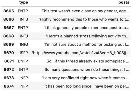 The MBTI dataset can be downloaded publicly on the website of Kaggle. It’s originally scrapped form a website called “Personality Cafe”. The dataset contains 8675 inputs form different users. Each input consists of 50 recent comments from a user and each user is labeled the corresponding MBTI type.